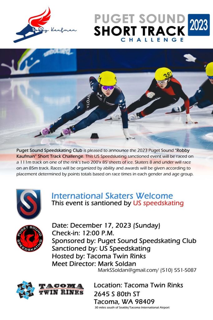 Puget Sound Speedskating Club is pleased to announce the 2023 Puget Sound “Robby Kaufman” Short Track Challenge. This US Speedskating sanctioned event will be raced on a 111m track on one of the rink’s two 200′ x 85′ sheets of ice. Skaters 8 and under will race on an 85m track. Races will be organized by ability and awards will be given according to placement determined by points totals based on race times in each gender and age group.