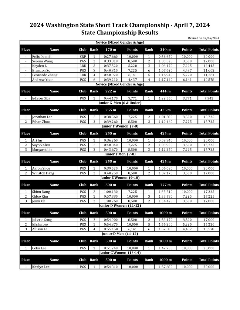 Puget Sound Speedskating Club is pleased to announce the 2024 WA State Short Track Championship. This US Speedskating sanctioned event will be raced on a 111m track on one of the rink’s two 200′ x 85′ sheets of ice. Skaters 8 and under will race on an 85m track. Each competitor will race 3 distances. Time permitting, relay races will be held after all distance races. Racers will be placed in divisions according to their ability determined by entry seed times. Skaters who select the “Novice” designation will race in novice-only races. Event officials may rearrange heats in the interest of safety. Awards will be given according to points totals in each gender and division.