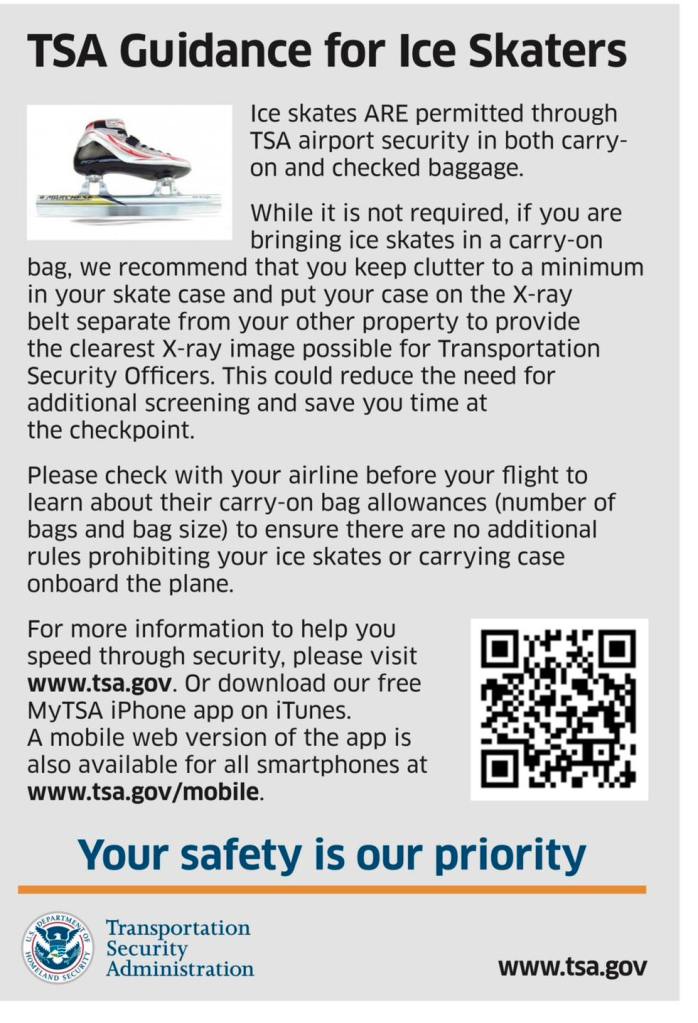 Most other International Transportation Security Agencies do not allow skates in your carry on bag. If you are flying outside of the USA or Canada, you should remove your blades from your boots, carry your boot on the plane with you, and check the blades. If you luggage is lost, you may be able to purchase or borrow blades when you get to your destination, but it is unlikely that you will be able to find boots that will fit you.