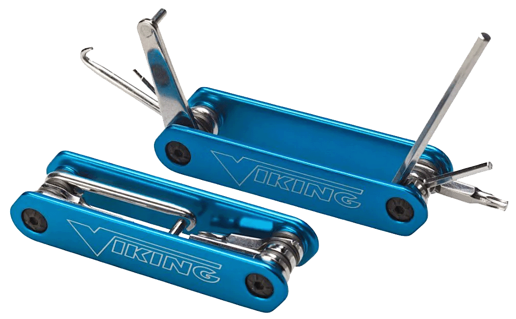 If you have to remove your long track blades from your boots, remove the blades from the bridges and leave the bridges attached to the boots in your carry on bag. That way, you won’t have to set up or adjust your blades when you reattach them when you get to your destination. Make sure you do this with the springs removed to avoid cross threading the pivot bolt. The Viking Multi-Tool is the pefect tool for this process.