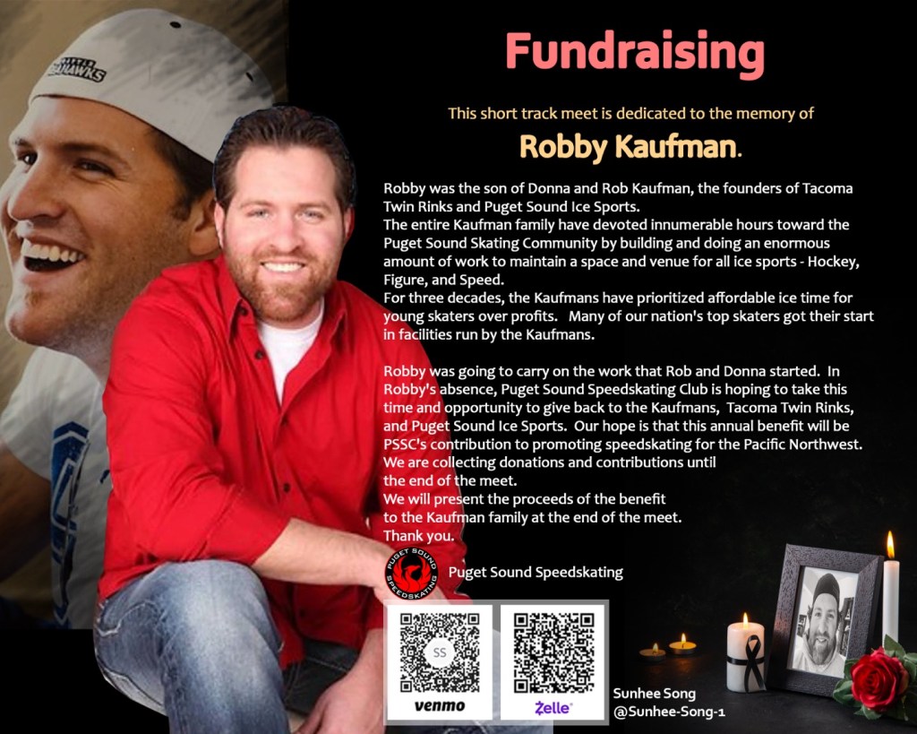 Robby was going to carry on the work that Rob and Donna started. In Robby’s absence, Puget Sound Speedskating Club is hoping to take this time and opportunity to give back to the Kaufmans, Tacoma Twin Rinks and Puget Sound Ice Sports. Our hope is that this annual benefit will be PSSC’s contribution to promoting speedskating for the Pacific Northwest.